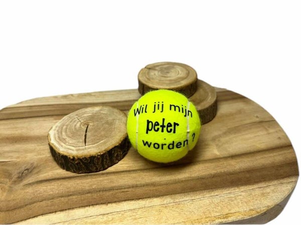 De tekst staat ofwel op de tennisbal, koker, of beide.